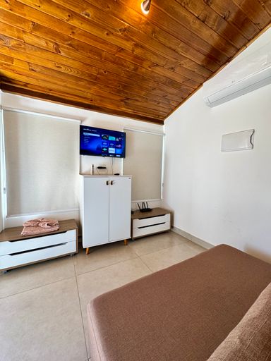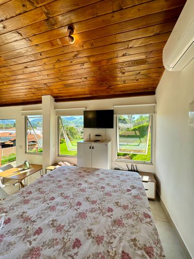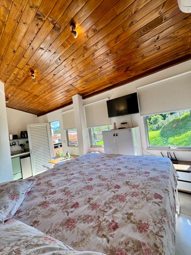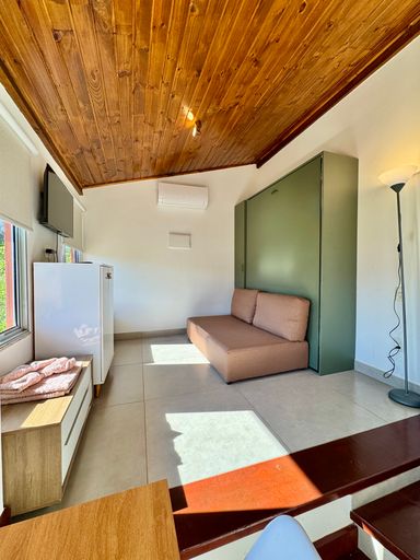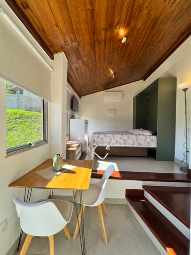 O interior é compacto, mas muito bem planejado: um ambiente charmoso e aconchegante, ideal para uma pessoa ou casal. A casa oferece internet, ar-condicionado, televisão, cama de casal retrátil e cozinha equipada com cooktop de indução portátil, air fryer, micro-ondas, torradeira, panelas e utensílios diversos.
